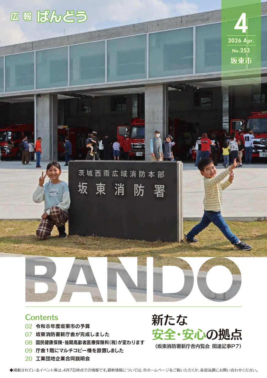 表紙 「新たな安全・安心の拠点」 ・令和8年度坂東市の予算 ・坂東市統計功労者表彰 ・坂東消防署新庁舎が完成しました ・国