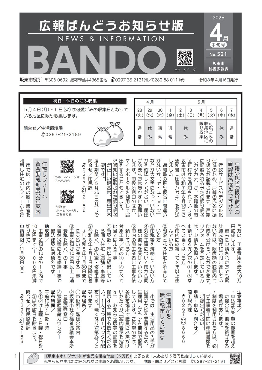 広報ばんどう お知らせ版 令和8年4月16日号 No.521