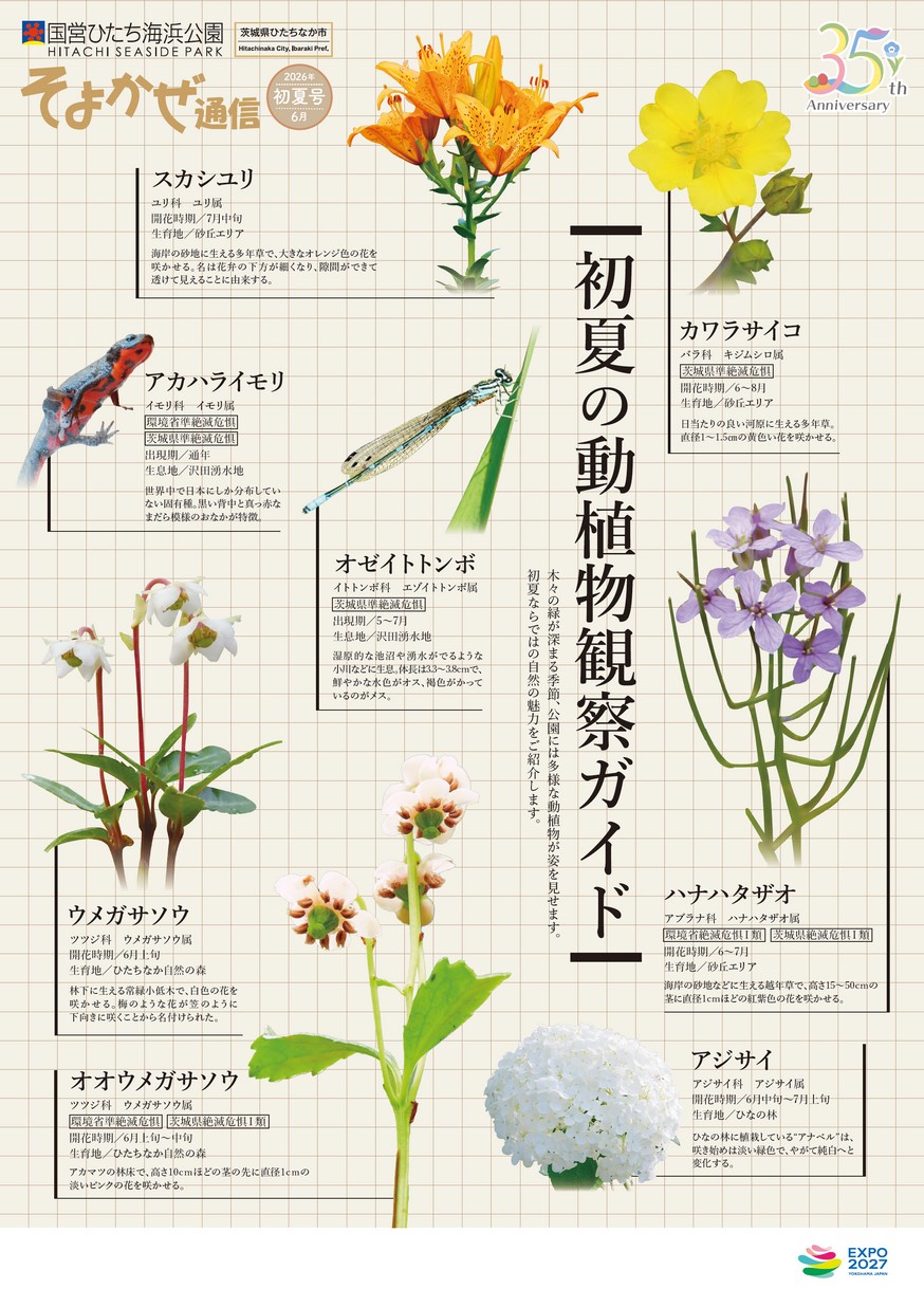 表紙 この花の正体は? ・自然発見 初夏の気象動植物のふしぎ!? ・パークパートナーと公園スタッフ座談会 ・EVENT IN