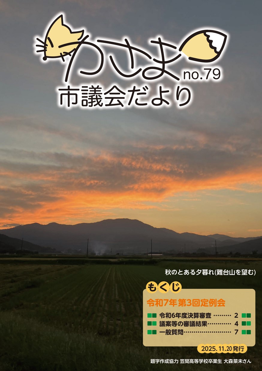 表紙 秋のとある夕暮れ(難台山を望む) ・令和7年第3回定例会 ・令和6年度決算審査 ・議案等の審議結果 ・一般質問 ・