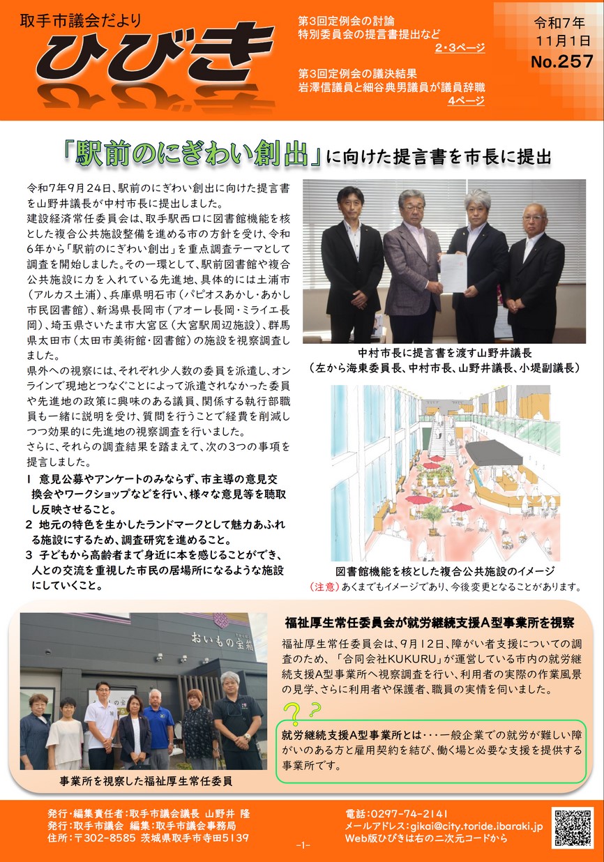 表紙 「駅前のにぎわい創出」に向けた提言書を市長に提出 ・討論 市長提出議案 決算認定 請願 ・令和7年第3回定例