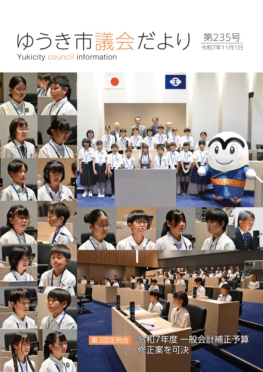 表紙 第12回結城市子ども議会 ・令和7年度 一般会計補正予算修正案を可決 ・令和6年度決算の状況 ・一般質問 ・委員会活
