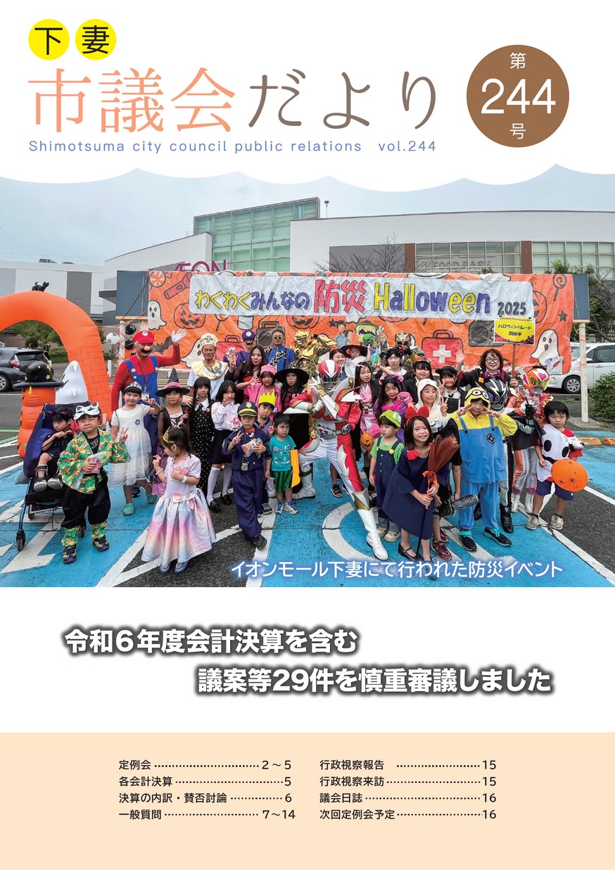 表紙 イオンモール下妻にて行われた防災イベント ・定例会 ・一般質問 ・行政視察報告 ・議会日誌 ・次回定例会予定 な