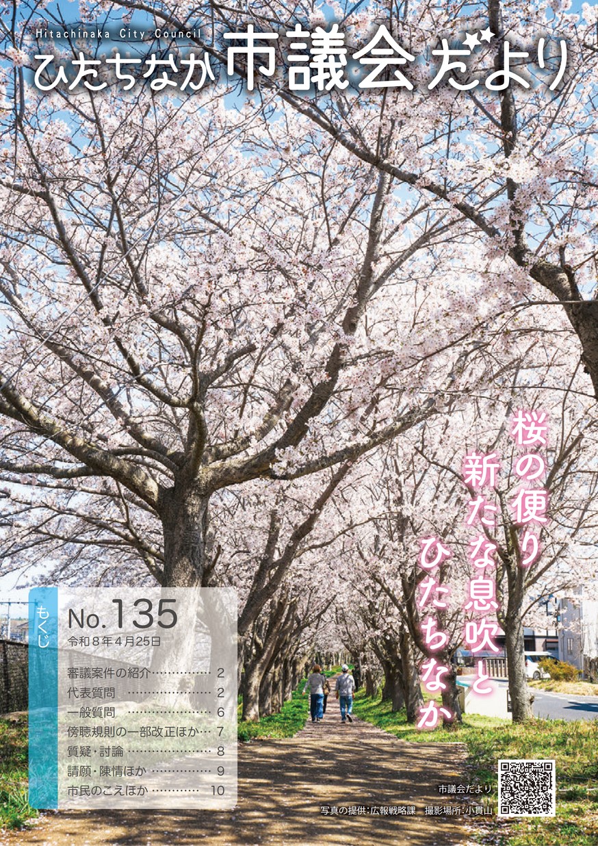 表紙 桜の便り 新たな息吹と ひたちなか ・審議案件の紹介 ・代表質問 ・一般質問 ・傍聴規則の一部改正ほか ・質疑・討