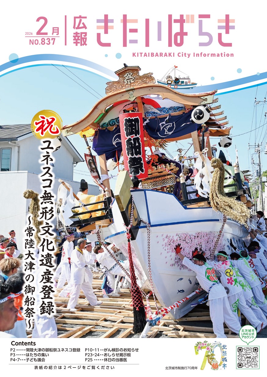 表紙 祝ユネスコ無形文化遺産登録 ~常陸大津の御船祭~ ・令和8年はたちの集い ・子ども議会 ・令和7年度 北茨城市表彰