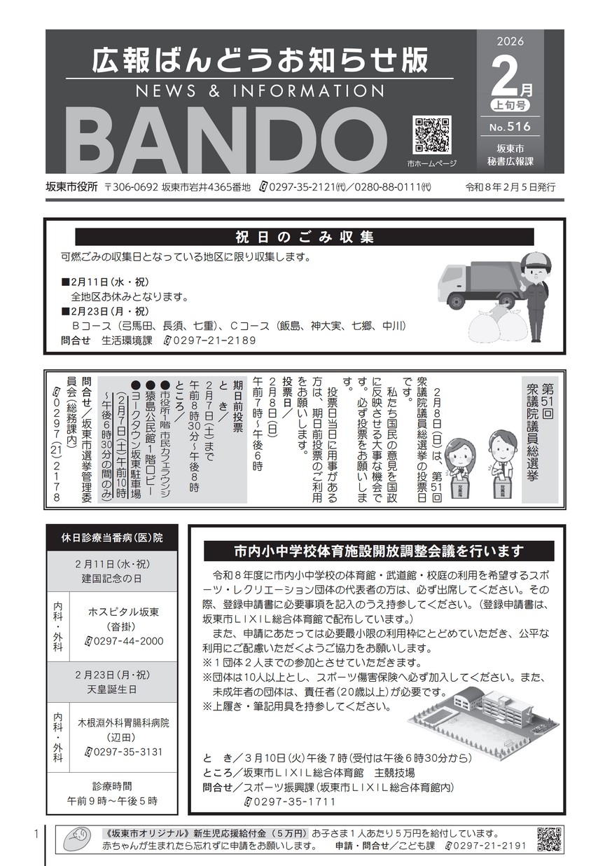 ・祝日のごみ収集 ・パブリック・コメントの結果をお知らせします ・コミュニティバス「坂東号」の一部バス停が廃止になります ・