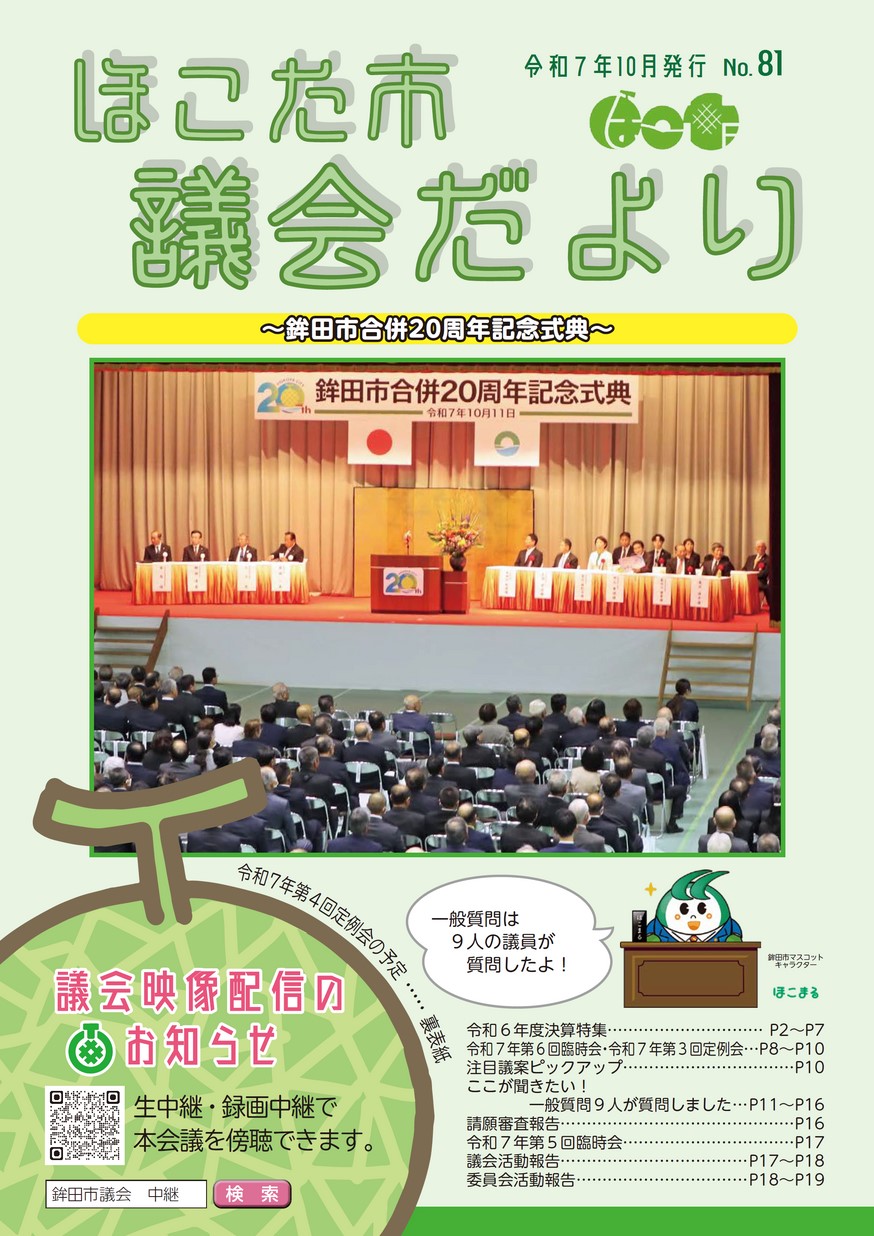 表紙 鉾田市合併20周年記念式典 特集 令和6年度決算 ・令和7年第6回臨時会・令和7年第3回定例会 ・注目議案ピックアップ