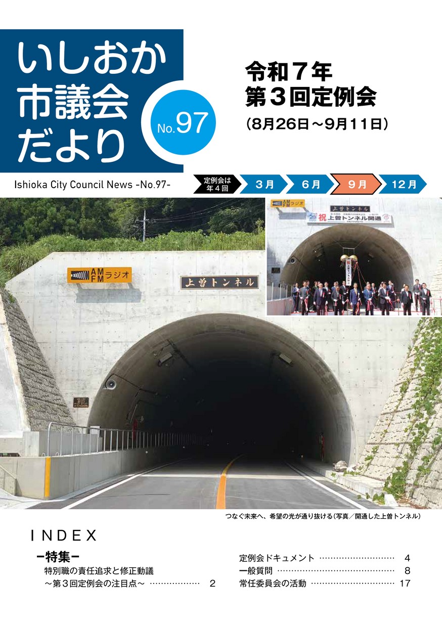 表紙 つなぐ未来へ、希望の光が通り抜ける 特集 特別職の責任追及と修正動議 ~第3回定例会の注目点~ ・定例会ドキュメ