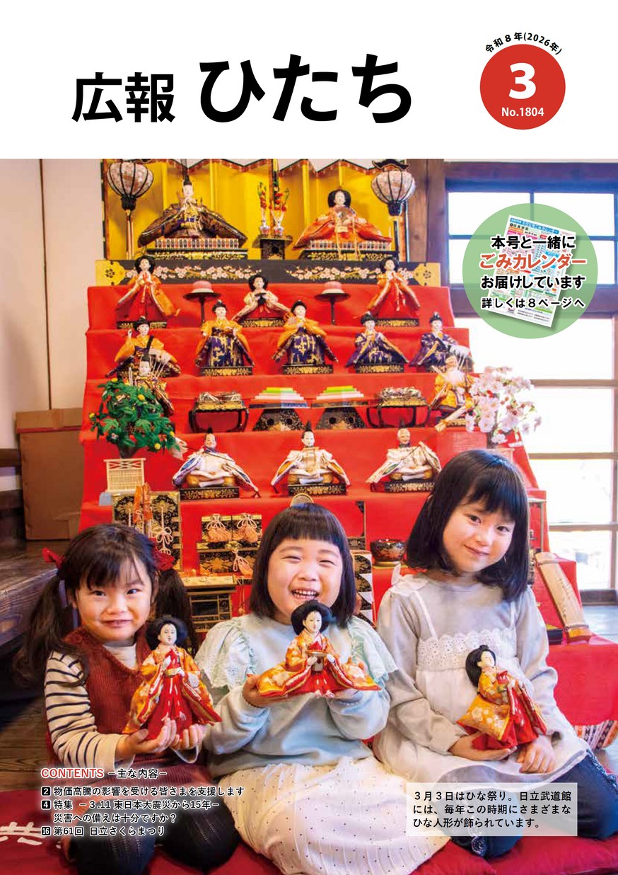 表紙 幸福願うひなまつり ・輝く人 ・筑西ブランド認証制度改定 ・廃食用油回収事業開始 ・ちくせい市政懇談会 ・3月は自