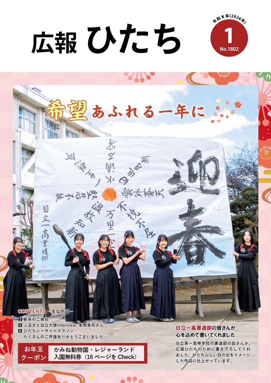 表紙 希望あふれる一年に ・新年のご挨拶 ・ふるさと日立大使Interview 本間幸司さん ・ひたちシーサイドマラソン