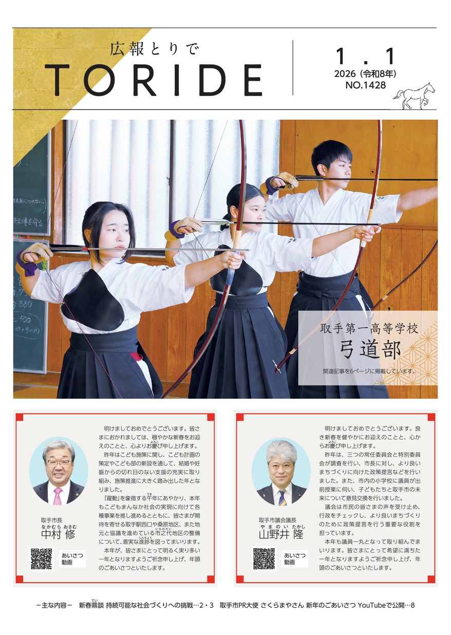 表紙 取手第一高等学校弓道部 ・2026新春鼎談 持続可能な社会づくりへの挑戦 ・とりでスクール・アートフェスティバル2026