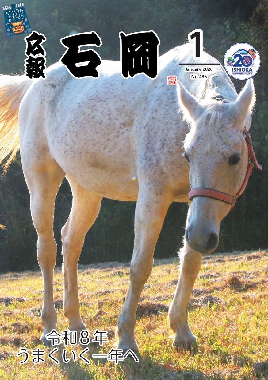 表紙 令和8年 うまくいく一年へ 特集1 いしおかではたらく人コマ 特集2 伝える、つなぐ、広報いしおか 特集3 行かない窓