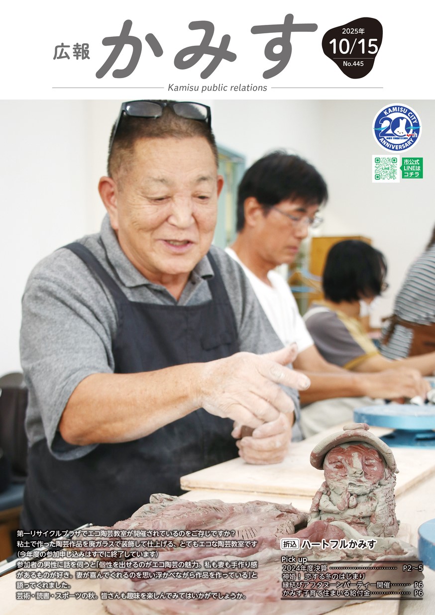 表紙 エコ陶芸教室 ・2024年度決算 ・縁結びアフタヌーンパーティー開催 ・市営豊ヶ崎住宅 入居者募集 ・かみすナビ