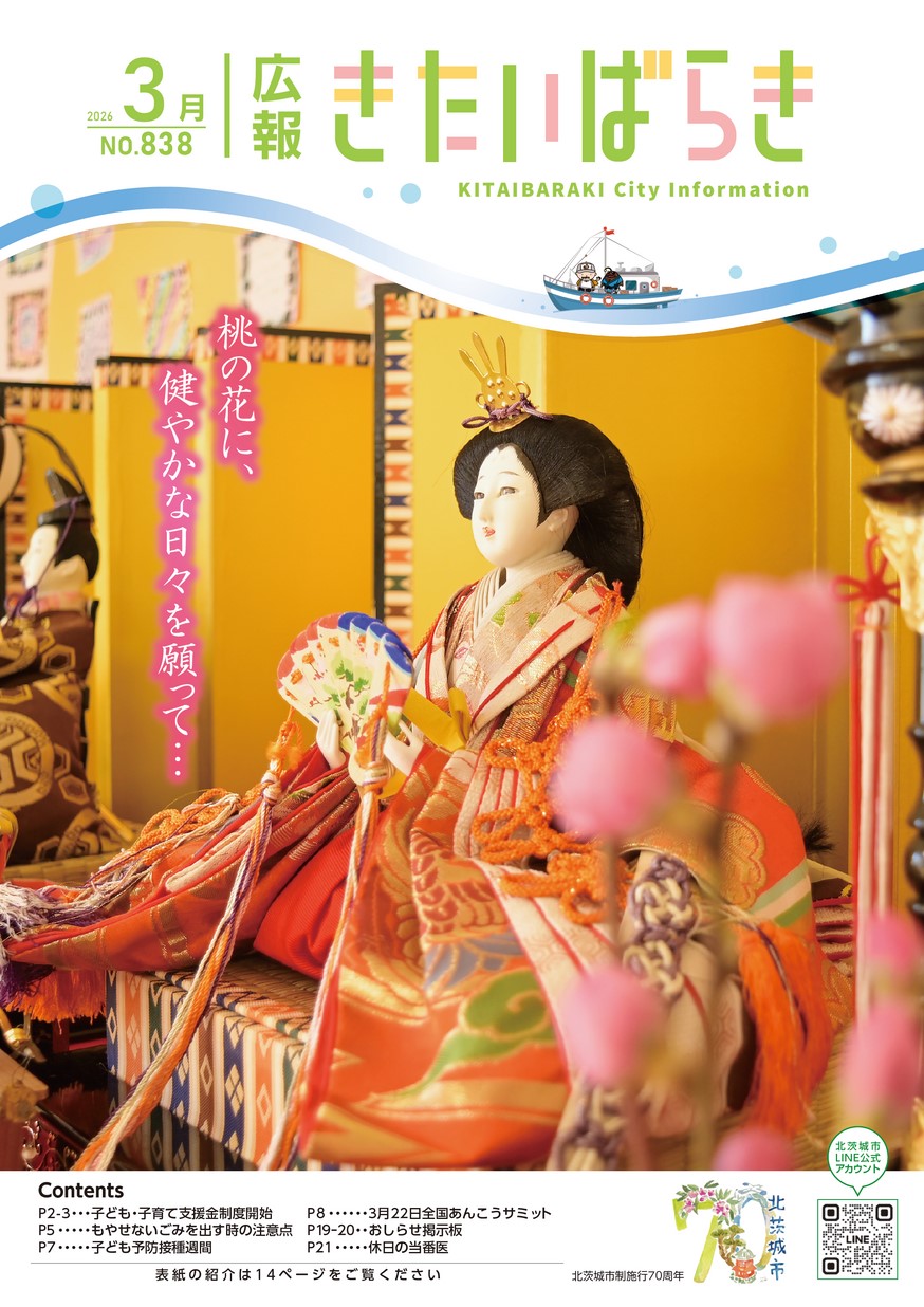 表紙 第17回 北茨城ひなあかり ・子ども・子育て支援金制度が開始します ・県市長会民間自治功労者表彰 ・もやせないごみを出
