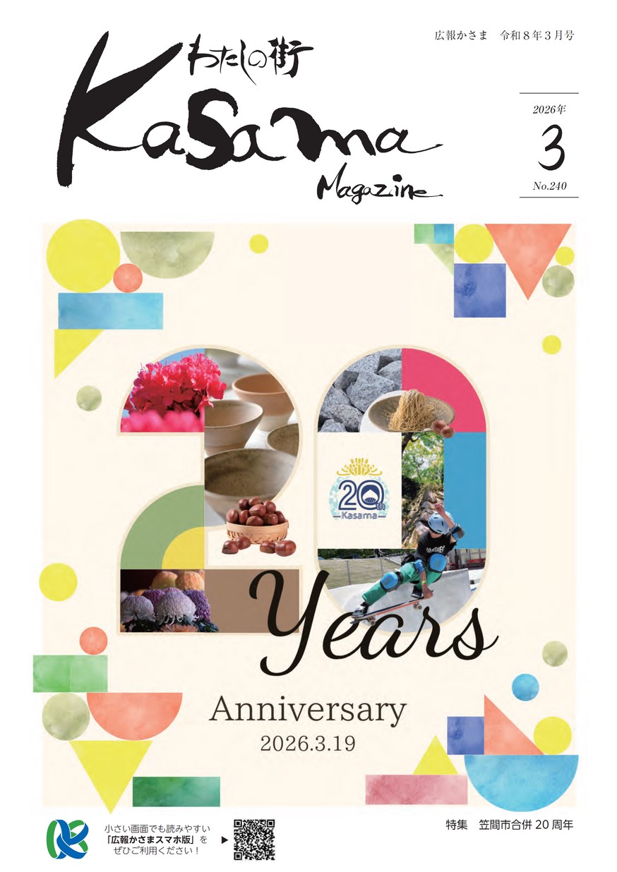 特集 笠間市合併20周年 ・市長コラム ・まちおこしのスパイス ・からだと向き合う ・情報しっとく日和 ・Sustain