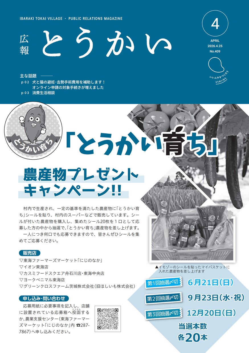 ・「とうかい育ち」農産物プレゼントキャンペーン ・犬と猫の避妊・去勢手術費用を補助します! ・消費生活相談 ・情報ガイド