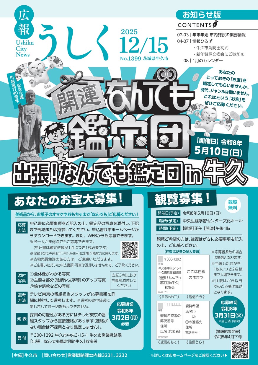 表紙 出張!なんでも鑑定団in牛久 ・年末年始 市内施設の業務情報 ・年末年始のごみ出しは計画的に! ・情報ひろば 市か
