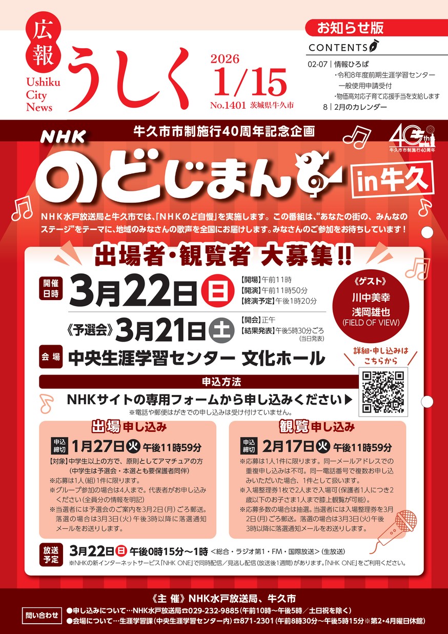 表紙 NHKのどじまんin牛久 ・情報ひろば 市からのお知らせ 人材募集・就職支援 スポーツ 催し・講座 相