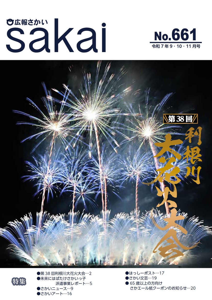 表紙・特集 第38回利根川大花火大会 ・未来にはばたけさかいっ子派遣事業レポート ・SAKAI TOWN NEWS ・さかい