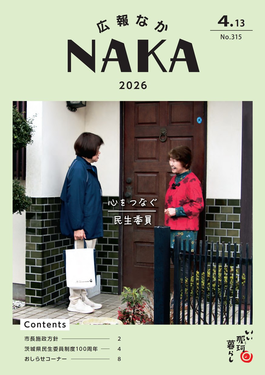 表紙 心をつなぐ民生委員 特集 令和8年度 那珂市施政方針 ・茨城県民生委員制度100周年 ・令和8年度那珂市予算 ・おし