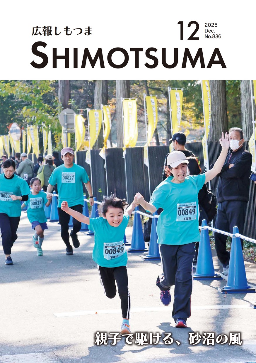 表紙 親子で駆ける、砂沼の風 ・2025砂沼親子マラソン ・しもつまイルミネーション ・TOPICS ~しもつまニュース~