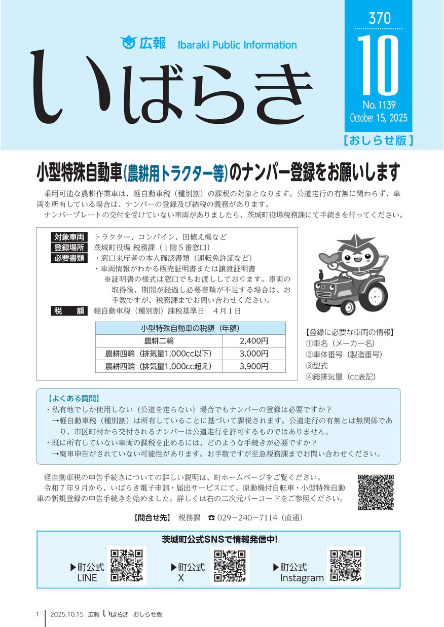 ・小型特殊自動車(農耕用トラクター等)の ナンバー登録をお願いします ・茨城町体力づくり10マイル駅伝大会参加チーム募集
