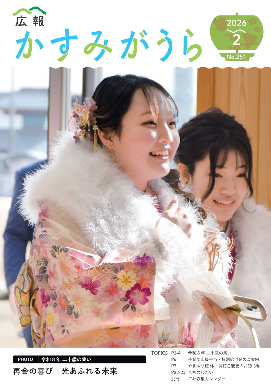 表紙 再会の喜び 光あふれる未来 ・令和8年 二十歳の集い ・子育て応援手当・特別給付金のご案内 ・お知らせと情報 くら