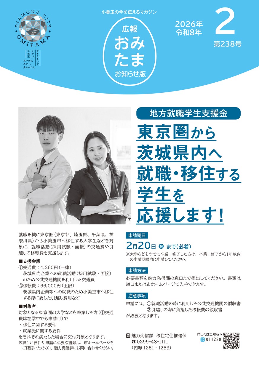表紙 東京圏から茨城県内へ就職・移住する学生を応援します! ・国民年金保険料は納付方法が選べます! ・小美玉市指定ごみ袋の有料