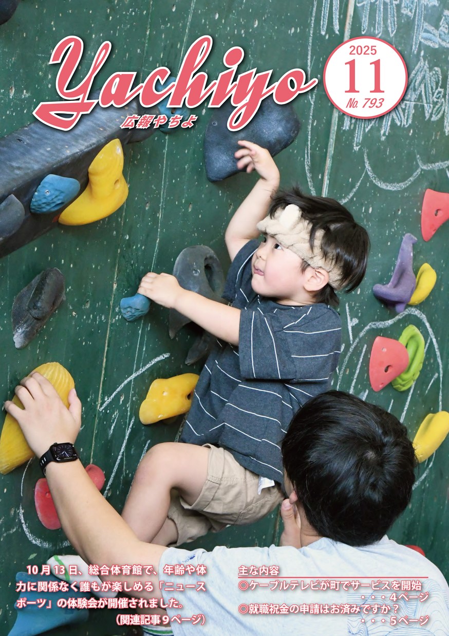 表紙 「ニュースポーツ」の体験会が開催 ・財政状況のお知らせ ・ケーブルテレビが八千代町でサービスを開始! ・就職祝金の申請