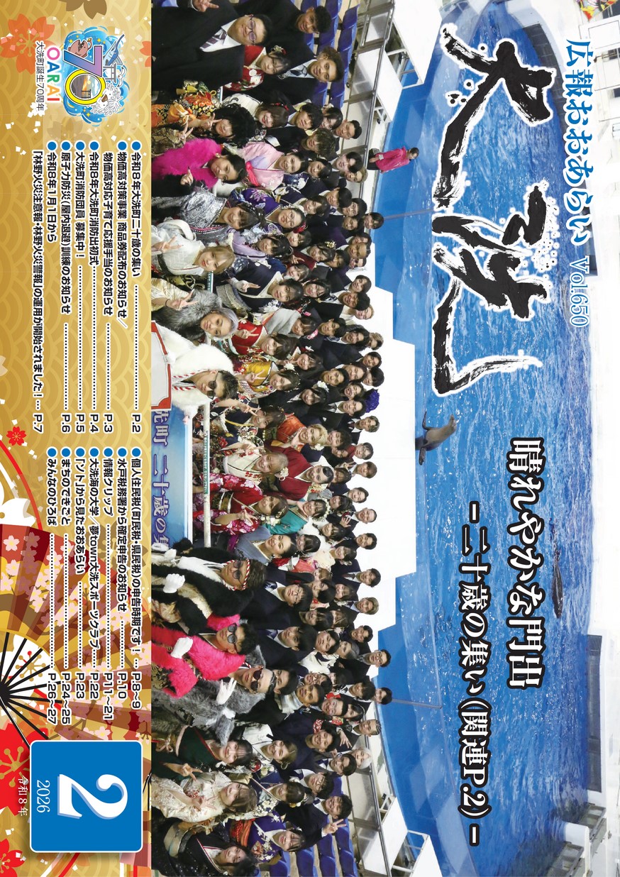 ・令和8年大洗町二十歳の集い ・物価高対策事業商品券配布のお知らせ ・令和8年大洗町消防出初式 ・大洗町消防団員募集中!