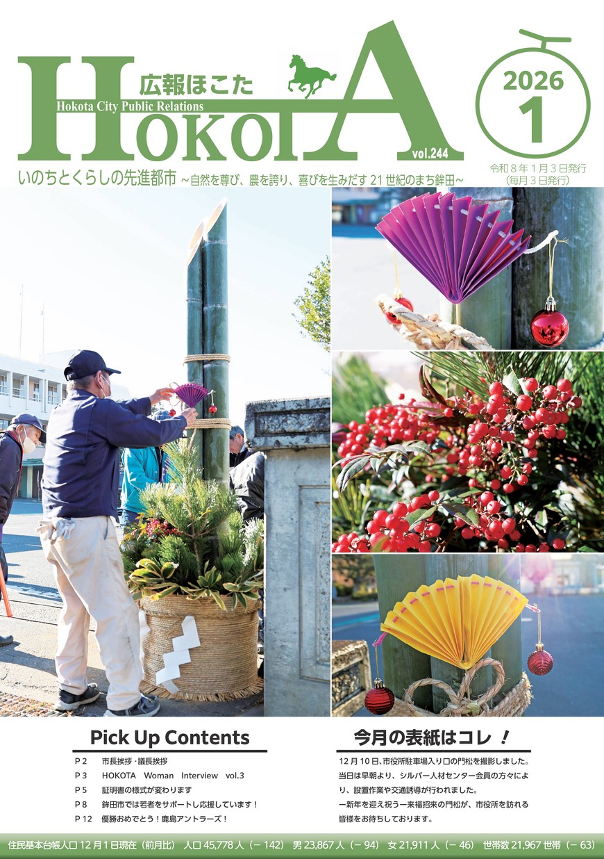 表紙 市役所駐車場入り口の門松 ・市長挨拶・議長挨拶 ・HOKOTA Woman Interview vol.3 ・市民税・