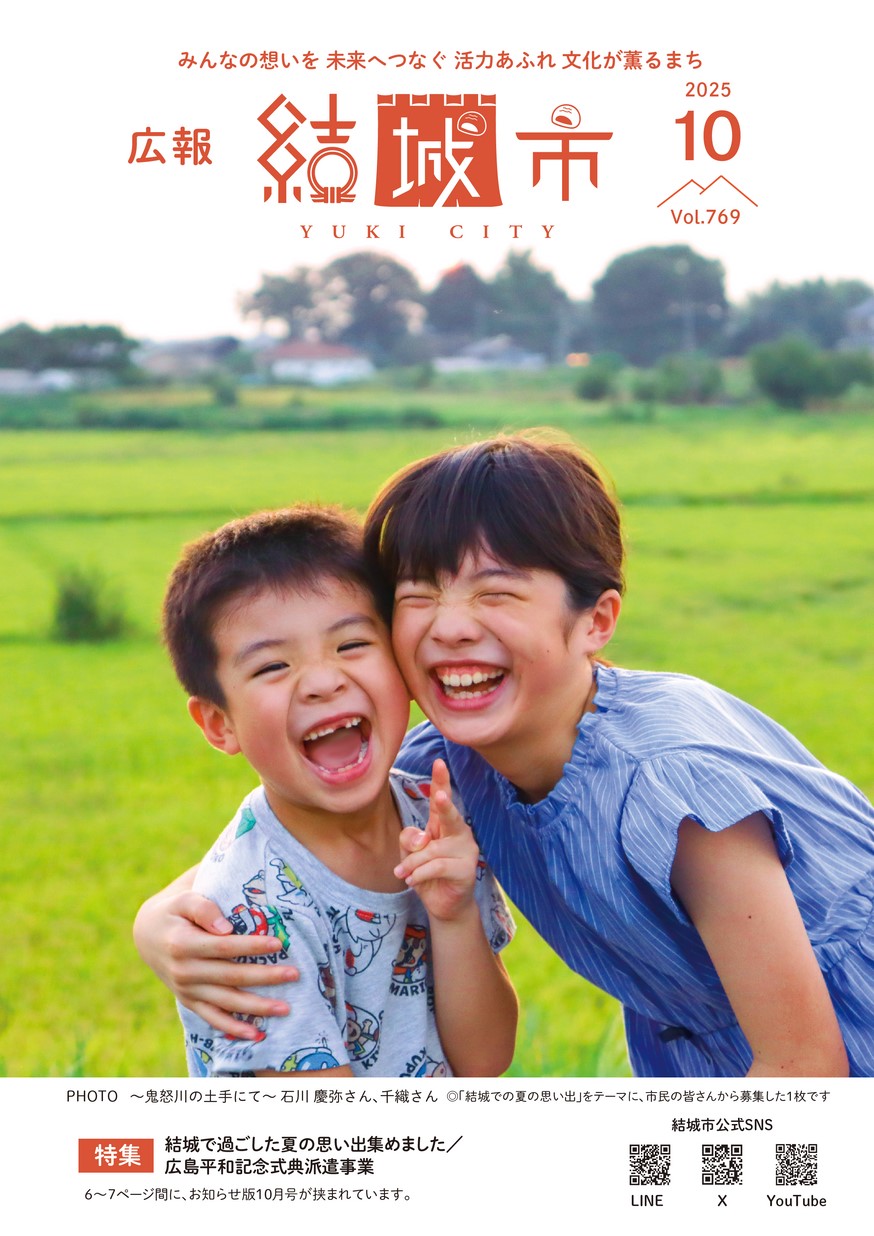 表紙 ~鬼怒川の土手にて~ 特集1 結城で過ごした夏の思い出集めました 特集2 広島平和記念式典派遣事業 ・子ども親善大使交