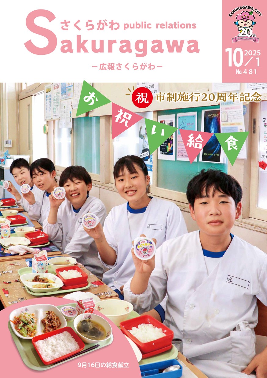 表紙 祝 市制施行20周年記念 お祝い給食 ・桜川市決算報告/桜川市の健全化判断比率 ・まちの話題 ・合同企業説明会/防災ラ