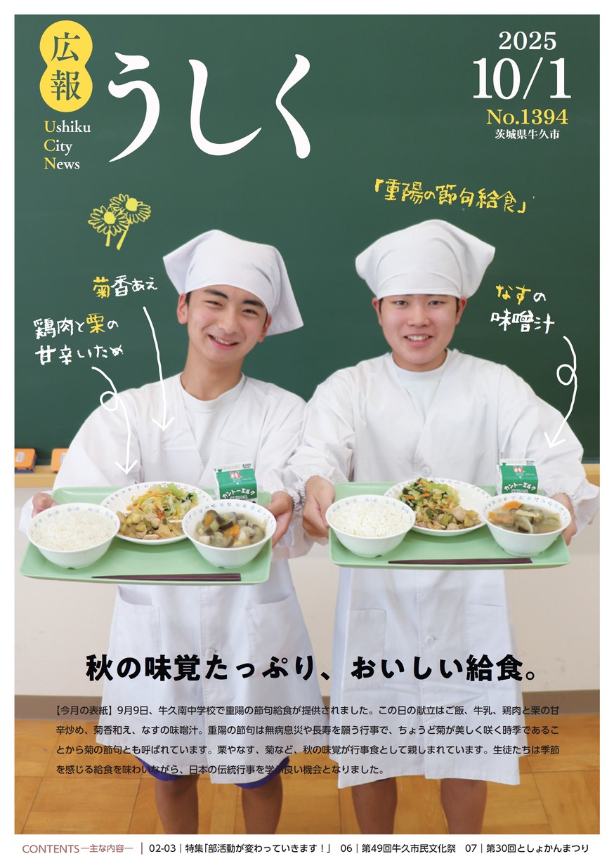 表紙 秋の味覚たっぷり、おいしい給食。 ・部活動が変わっていきます! ・牛久市男女共同参画 特別講座 ・Web口座振替受付サ